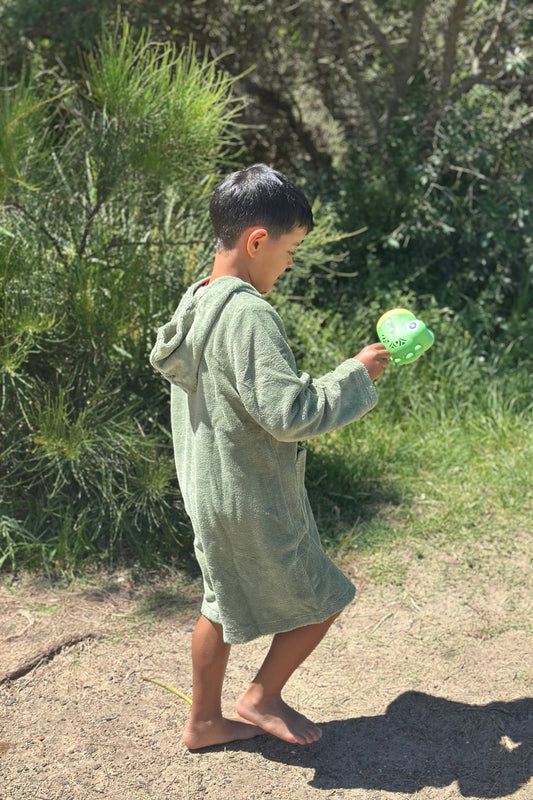 Love the colour! The green is so subtle and stylish it compliments all my swimwear and I love that the zip matches the colour perfectly. I got the towels matching my kids and honestly they're so comfortable sometimes we just wear them around the house. Can't wait to use mine all summer long, and winter in the sauna!